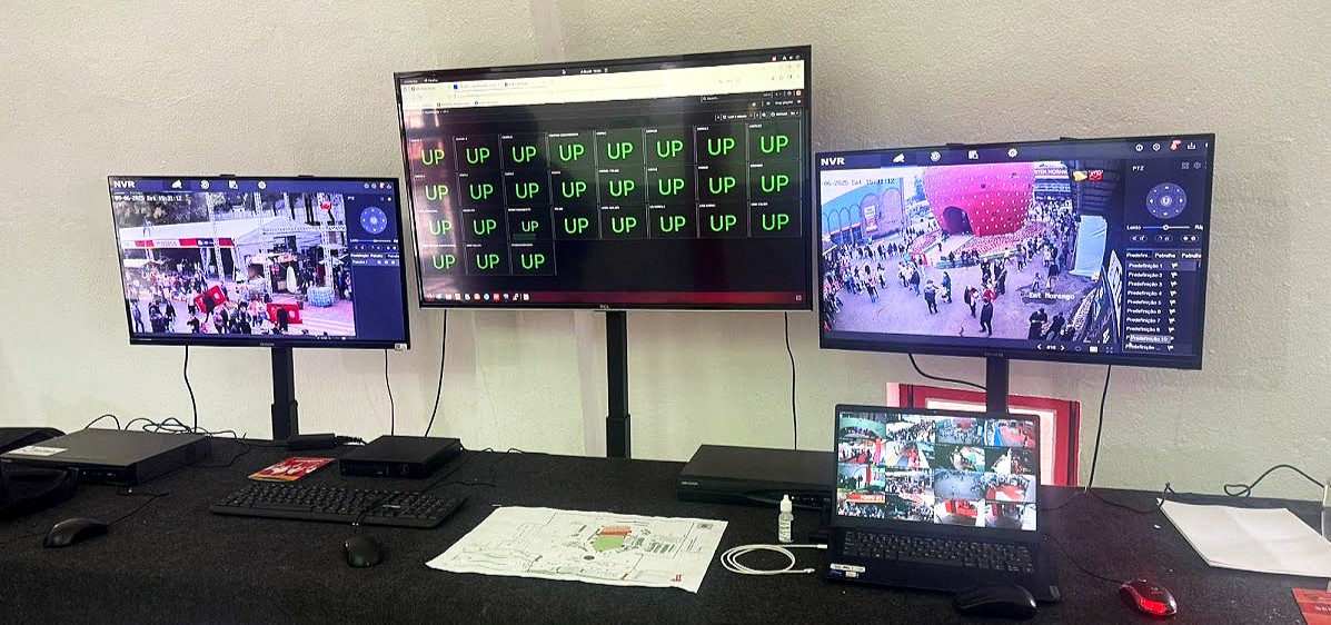 Mais do que apenas internet, entregamos segurança e controle. Nosso sistema de monitoramento foi projetado para dar à produção uma visão completa e em tempo real do evento: Mais de 20 câmeras fixas e 10 câmeras Speed Dome 360º cobriram pontos estratégicos. Monitoramento aéreo com drones permitiu uma visão privilegiada, garantindo comunicação direta com a equipe de produção para informar sobre ocorrências e agilizar o atendimento. Com o monitoramento 24x7 via Zabbix e Grafana, nossa equipe acompanhou a saúde de toda a infraestrutura de rede, antecipando problemas e garantindo estabilidade máxima.